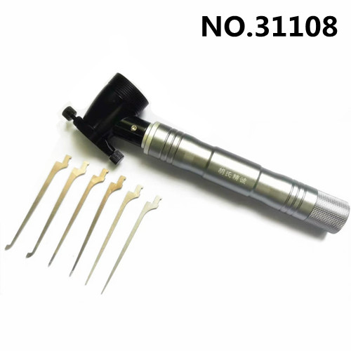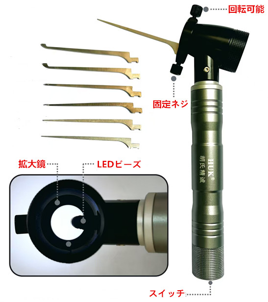 LED(輸入品)を1個搭載。ヘッド部分には高倍率ルーペが付属しており、シリンダー内部のディスク(タンブラー)をより鮮明に観察可能。 針6本が付き。角度は360度に調整可能です。